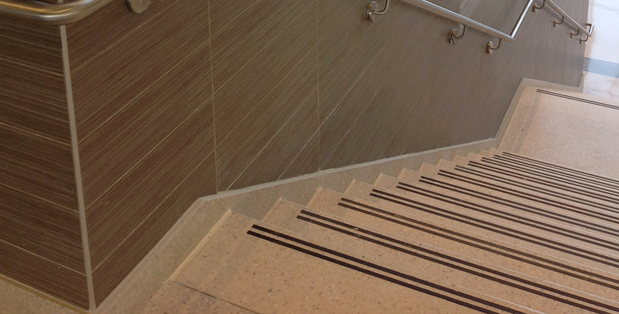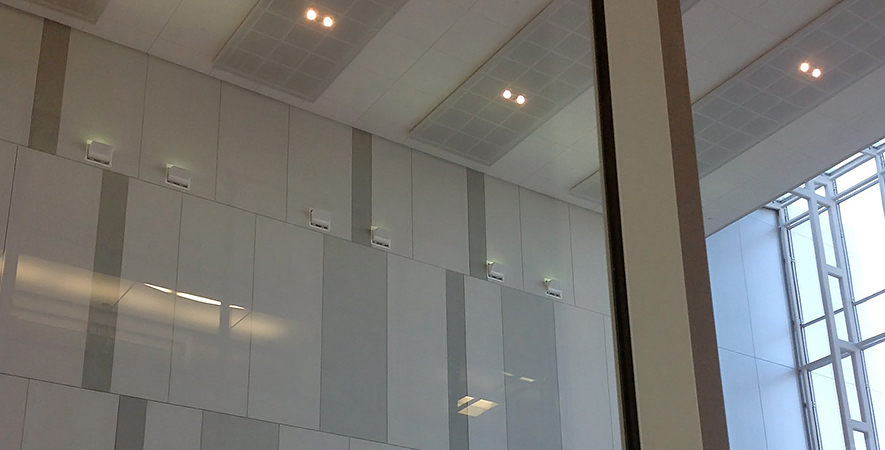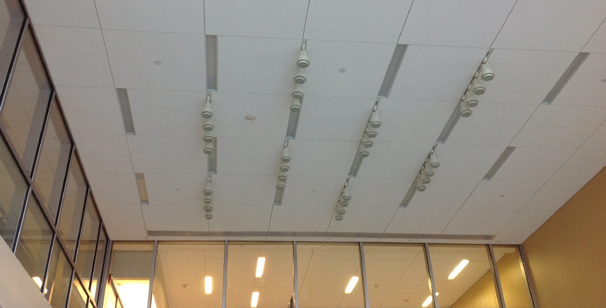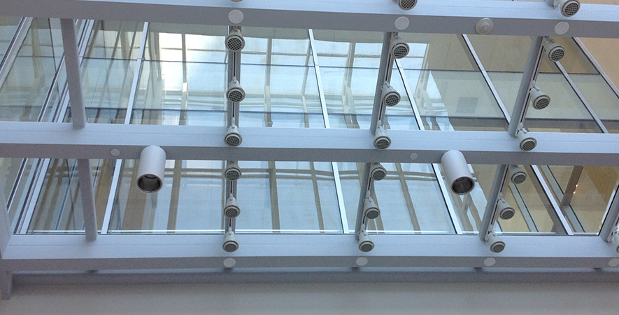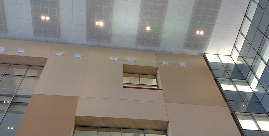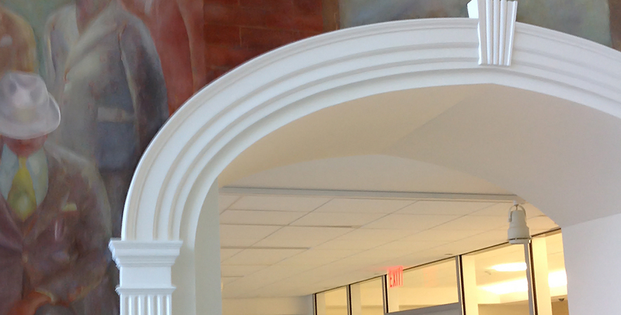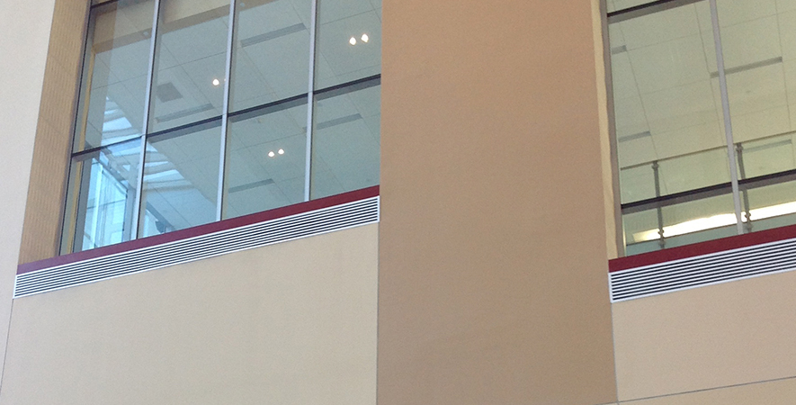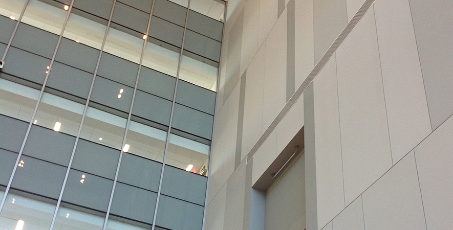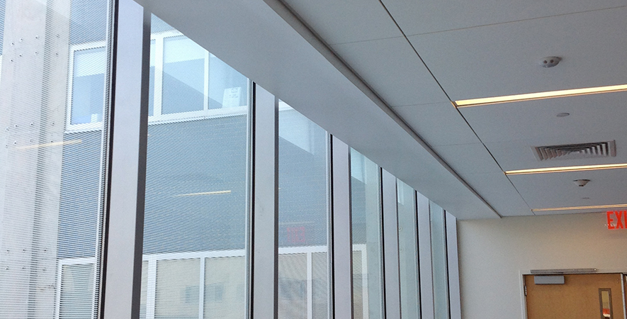 Drywall, acoustical ceilings, OSHA protection, 8 story atrium high-end finishes, with reveal bead, light gauge metal framing and sheathing, and modular art mill work panels, wood trim